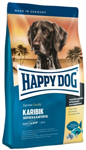 Happy Dog Supreme Karibik ist der getreidefreie Feinschmeckergenuss aus exklusiven Rohstoffen angelehnt an die besonderen Köstlichkeiten der karibischen Küche. Feinster Seefisch aus nachhaltigem Fang und hochverdauliche Kartoffeln verwöhnen Ihren Hund schonend und natürlich glutenfrei. Dank der ausgewählten und besonderen Eiweißquelle Hochseefisch – mit mittlerem Protein- und Energiegehalt – entlastet diese schmackhafte Rezeptur die Verdauung und ist auch für ernährungssensible Hunde aller Rassen bestens verträglich. Wertvolle Omega-3 und Omega-6 Fettsäuren runden den tropischen Genuss ab und sind wichtig für eine gesunde Haut und ein glänzendes Fell.