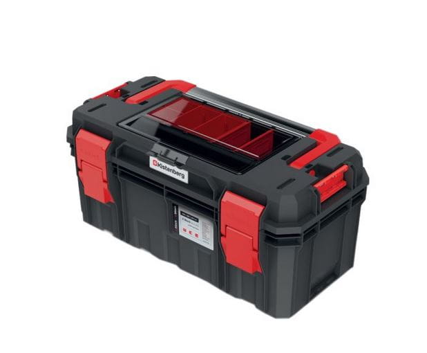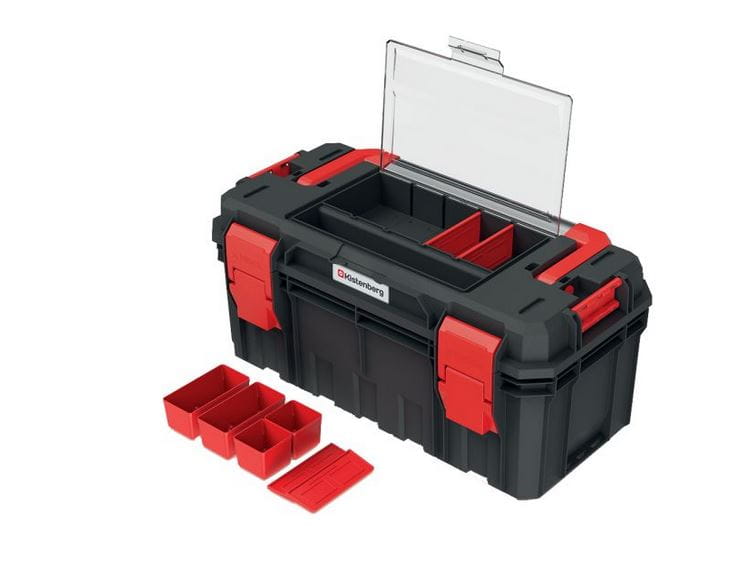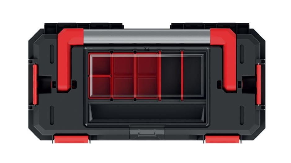 Die Box verfügt über einen stabilen Aluminiumgriff, eine herausnehmbare Trennwand sowie ein praktisches Innentragefach, das für mehr Übersicht und effiziente Organisation sorgt. Im Deckel befinden sich integrierte Organizer mit Bechern und Fächern, ideal zur Aufbewahrung von Kleinteilen. Die große, transparente Klappe besteht aus stoßfestem Polycarbonat, was eine besonders hohe Haltbarkeit garantiert.