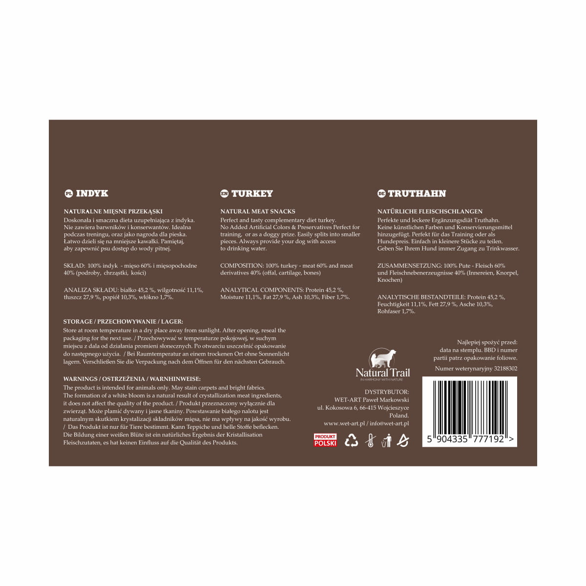 Zutaten: 100 % Pute (Fleisch 60% und Fleischenbenerzeugnisse - Innereien, Knorpel, Knochen 40%).